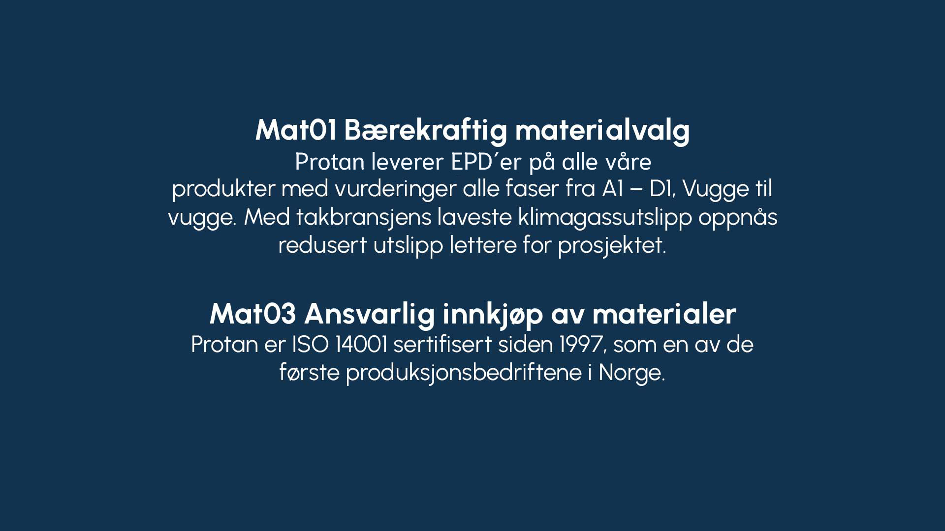 Protan sine materialer har takmarkedets laveste klimagassutslipp gjennom hele livsløpet. Protan kan bidra til redusert miljøpåvirkning i kategoriene Mat 01 - Bærekraftig materialvalg og Mat 03 - Ansvarlig innkjøp av materialer.