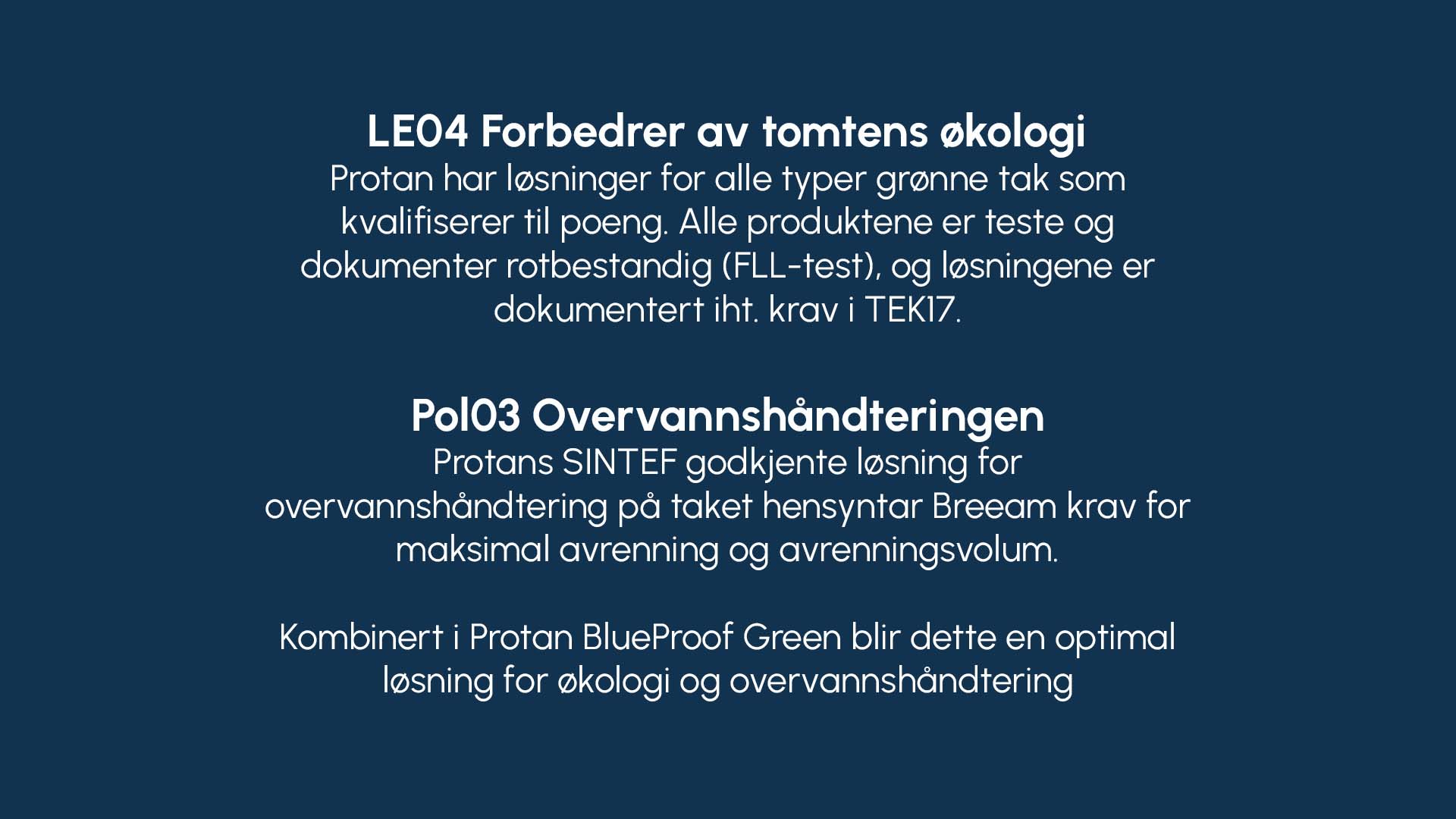 Protan bidrar til å forebygge flom med dokumentert overvannshåndtering på takene. Kombineres dette med ulike grønne tak blir dette bærekraftig arealbruk i kategoriene LE 04 - Forbedrer av tomtens økologi og Pol 03 – Overvannshåndteringen.