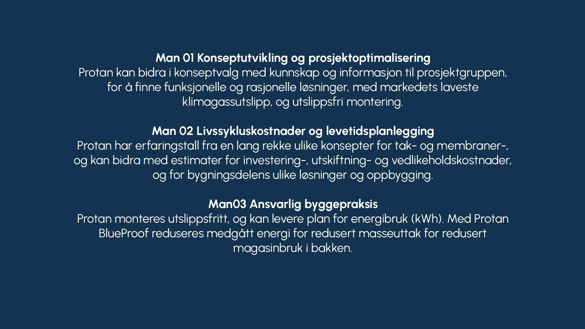 Protan bidrar til bærekraftig ledelsespraksis i kategoriene Man 01 Konseptutvikling og prosjektoptimalisering, Man 02 Livssykluskostnader og levetidsplanlegging og Man 03 Ansvarlig byggepraksis og bidrar til sikrer bærekraftsmål helt inn i driften av bygget.