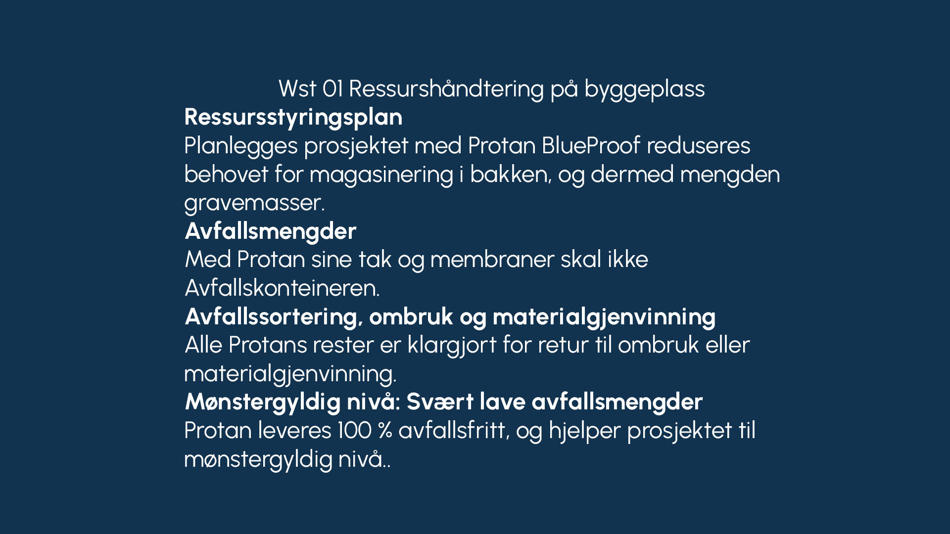 Protan bidrar til bærekraftig håndtering av avfall med ressurseffektiv prosjektering og med å redusere avfall på byggeplassen i kategorien Wst 01 - Avfallhåndtering på byggeplass.