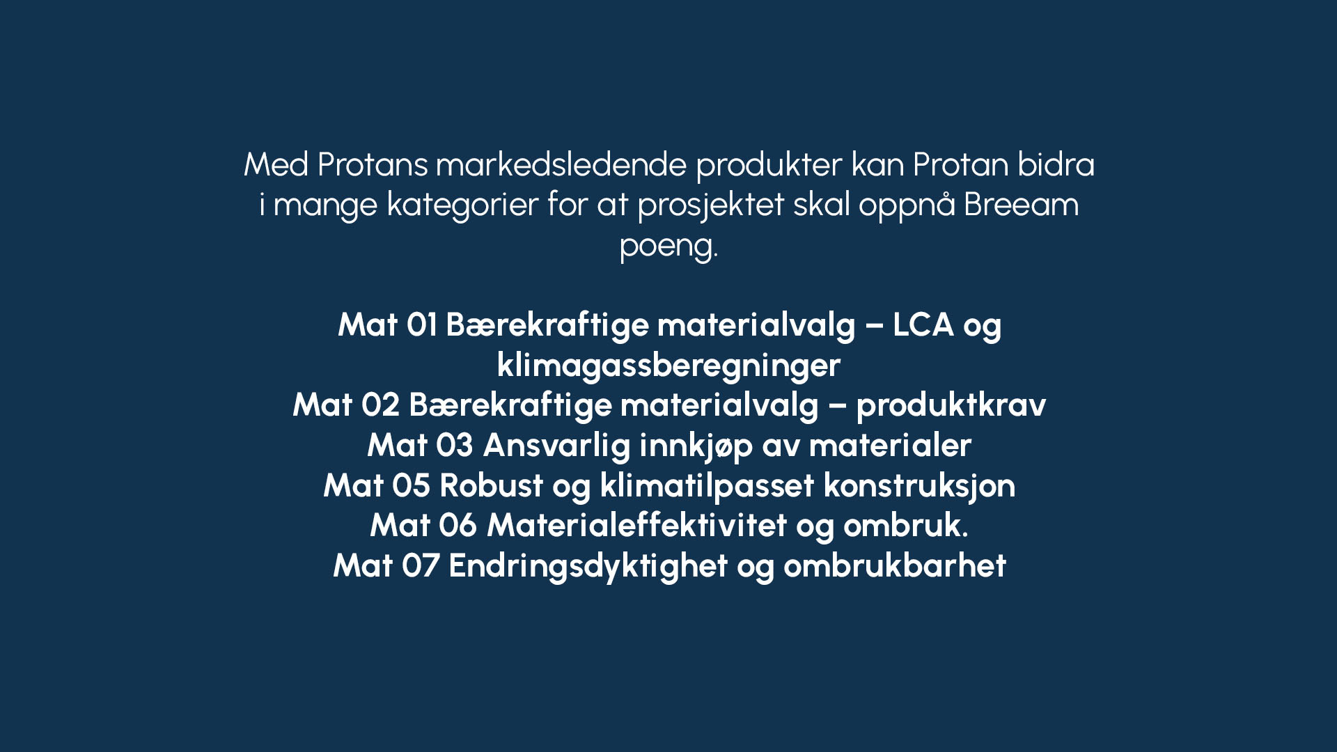 Ved å benytte Protans produkter og systemer kan bærekraftig materialvalg og ansvarlig innkjøp dokumenteres. Protan og Protans produkter og løsninger kan også bidra til at prosjektet oppnår poeng i andre kategorier.