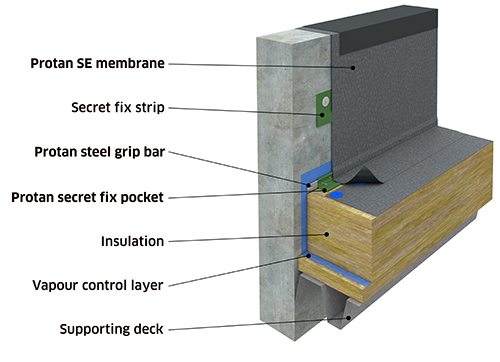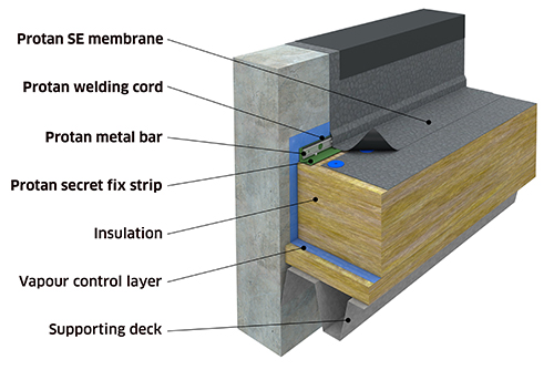Protan krever at innfestingen av takbelegget i overgangen mellom takflaten og parapet skal utføres lineært. Vår stålskinne gir god lufttetting, lineær fastholding og reduserer muligheten for punktbelastning i sveis og innfesting. Skinnens styrke og stivhet sørger for at horisontale og vertikale krefter i tekkingen overføres til denne som en jevnt fordelt last. Vi aksepterer flere tekniske løsninger for parapetinnfesting, men felles for disse er at en av Protans godkjente stålskinner skal benyttes. Se våre ulike takløsninger.