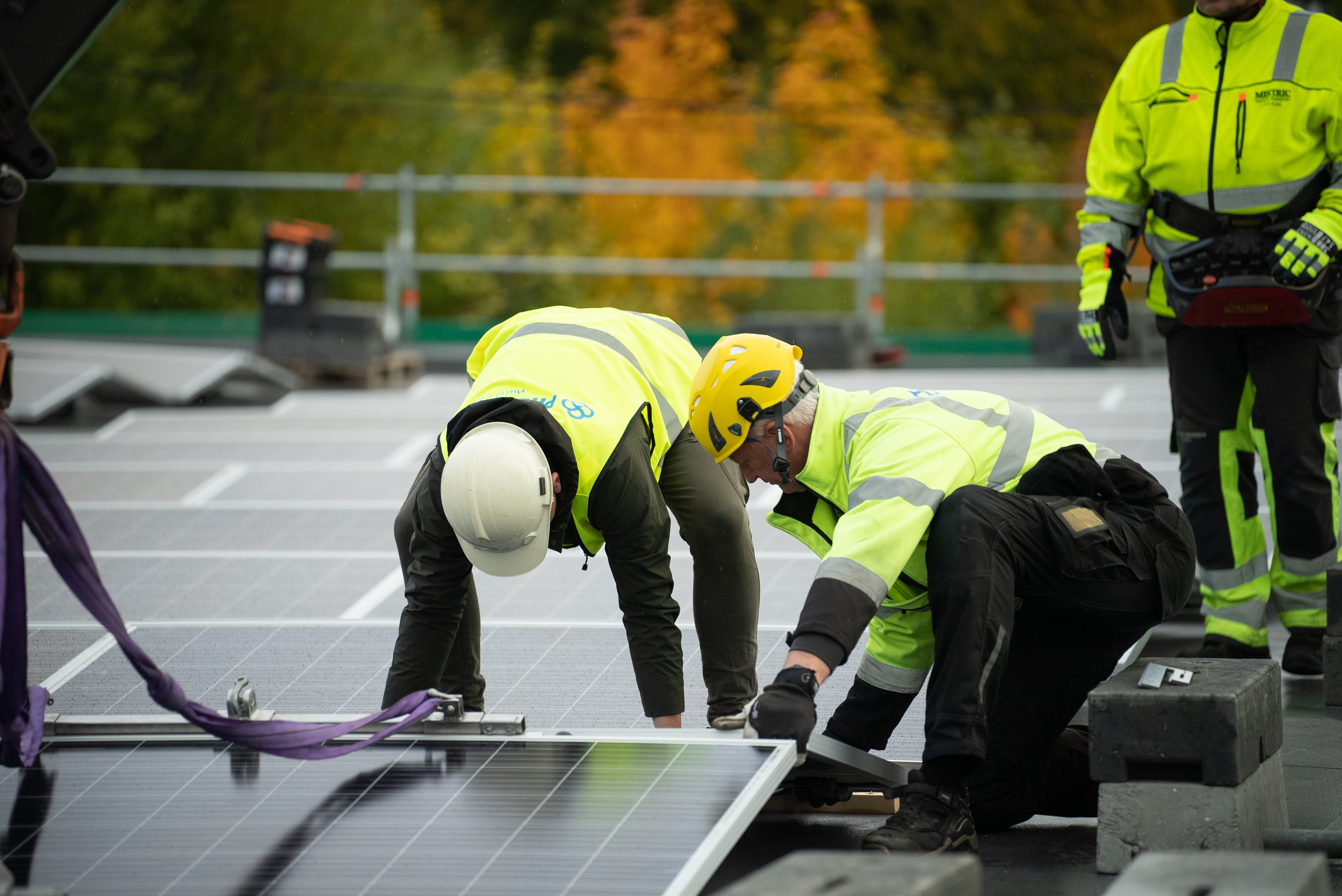 Solcelleløsningen er ballastert, så når panelene skrus fast, skjer det i skinner som skrus fast i betongheller, ikke gjennom å skru ned i takmembranen.