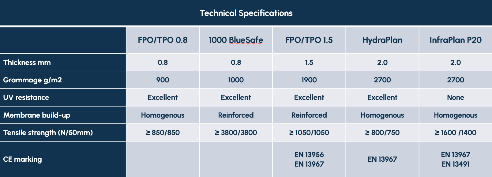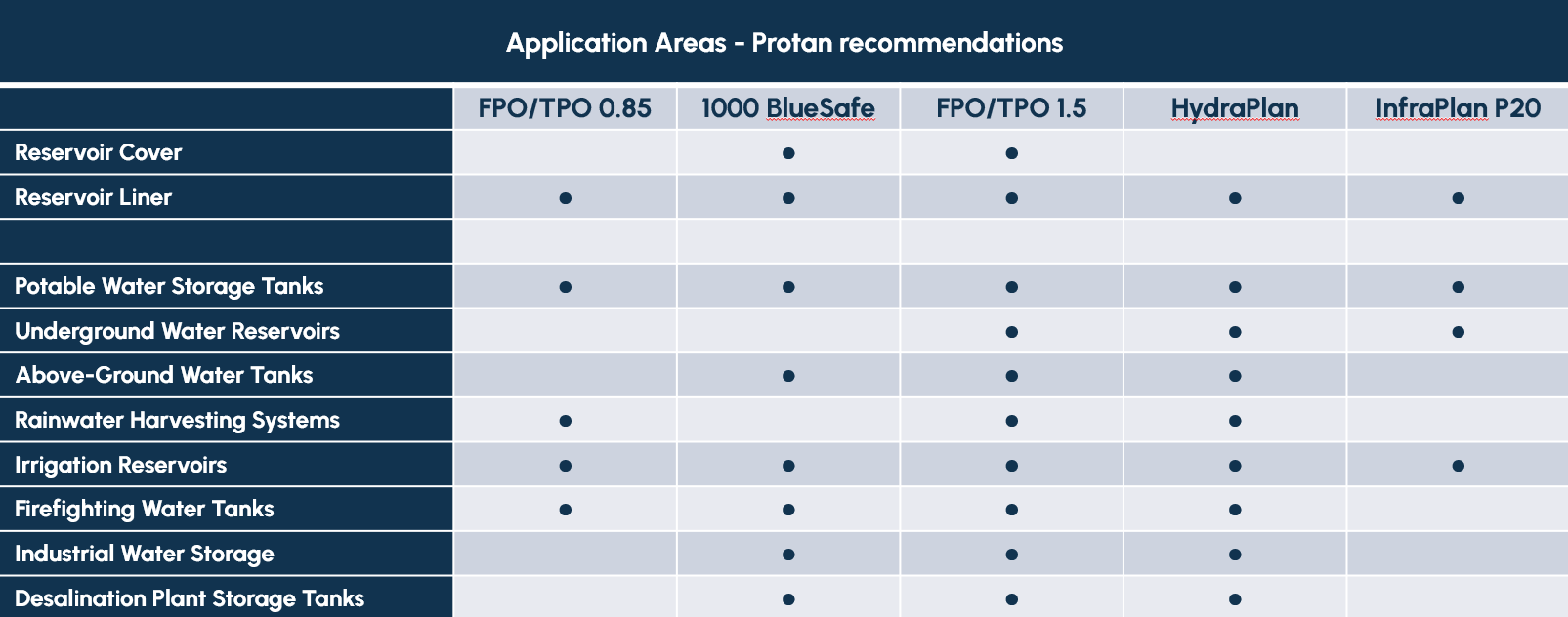 Protan membraner gir sikre, hygieniske og vanntette løsninger for drikkevannslagring. Materialet er UV-bestandig og tåler varierende temperaturer, samtidig som fleksibiliteten gjør det enkelt å tilpasse ulike tanker og reservoarer.